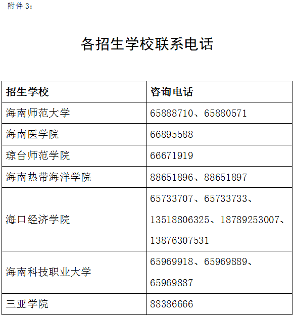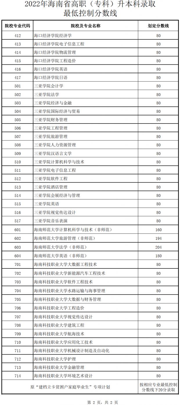 公告指出,海南省高职(专科)升本科招生录取分数线在考生成绩不低于80分的基础上,按照招生学校各专业计划数1:1比例从高分到低分划定。其中原建档立卡贫困户家庭毕业生专项计划录取最低控制分数线为划定相应专业录取分数线下20分(详见附件1),退役大学生士兵专项计划由学校根据职业适应性或职业技能综合考察结果,并结合考生在校期间成绩、服役期间表现等情况,综合评价,按照各专业招生计划数1:1的比例择优录取。考生成绩不低于划定报考学校相应专业的最低录取控制分数线,则确认为所报考学校相应专业预录取的考生,考生也可向报考学校查询本人的预录取信息。