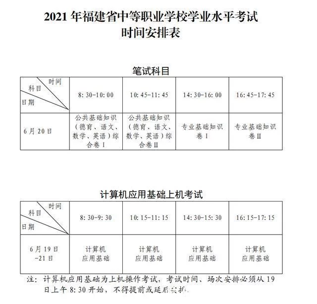 根据《福建省教育厅关于做好2021年中等职业学校学业水平考试工作的通知》(闽教职成〔2021〕7号),由省统一组织的2021年中等职业学校学业水平考试将于6月19日-21日举行。为做好报名工作,现将有关事项通知如下: