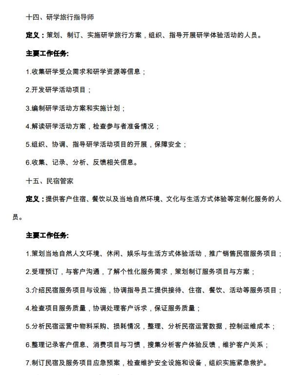 据悉,随着《家庭教育促进法》的出台实施和双减等政策的推行,确立从事家庭教育和研学旅行指导人员的职业属性、界定职业工作任务等显得很有必要,基于此,专家和有关部门提出了家庭教育指导师研学旅行指导师2个新职业。为满足广大旅游消费者个性需求的民宿行业蓬勃发展,短短几年便实现由0到百万级规模跨越的民宿管家得以设立为职业。