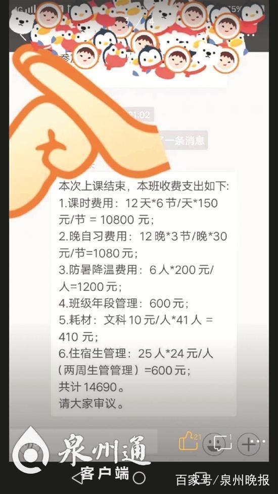 该微信群公告写着:衔接班今天下午结束了,这一阶段工作感谢各位家委、各位家长的支持。在群里,一名家长给出此次衔接班一个班的费用明细:课时费用10800元,晚自习费用1080元,防暑降温费用1200元,班级年段管理600元,耗材410元,住宿生管理600元,共计14690元。