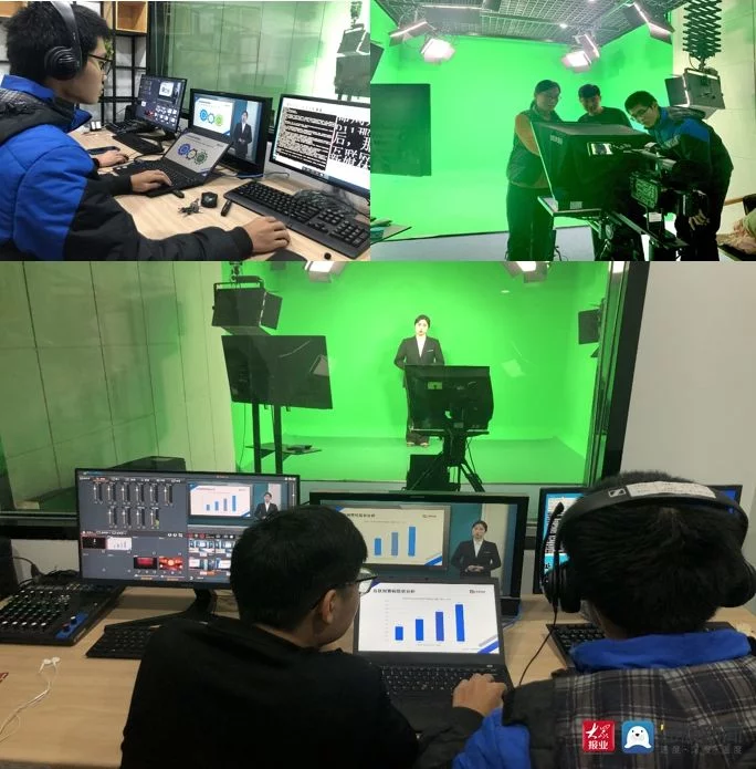 济南智赢动画设计有限公司李蕊、杨昌明老师在专班的教学中,结合影视后期与三维制作等工作岗位方向,分别引入了不同的企业项目,前来学校学习的宁夏同心职业技术学校的王照旭、宫青钊老师也与同学们一起到智赢动画演播室进行实的录制。企业老师根据每位同学的特点明确人员分工,完成了演播室摄像机、灯光、调音台、特技台等设备的调试工作,全面掌握了虚拟抠像技术及演播室录制工作的整个流程,让师生全方位参与到了课程资源建设的系列工作。另外一部分同学负责3D虚拟场景搭建项目的设计制作。从项目的整体架构、设计构思、创作理念的角度出发,组队讨论、团结协作。以产品质量及最终效果作为关键点进行切入,建模、材质、光影、场景等多方面分工合作,最终获得理想的创作效果。