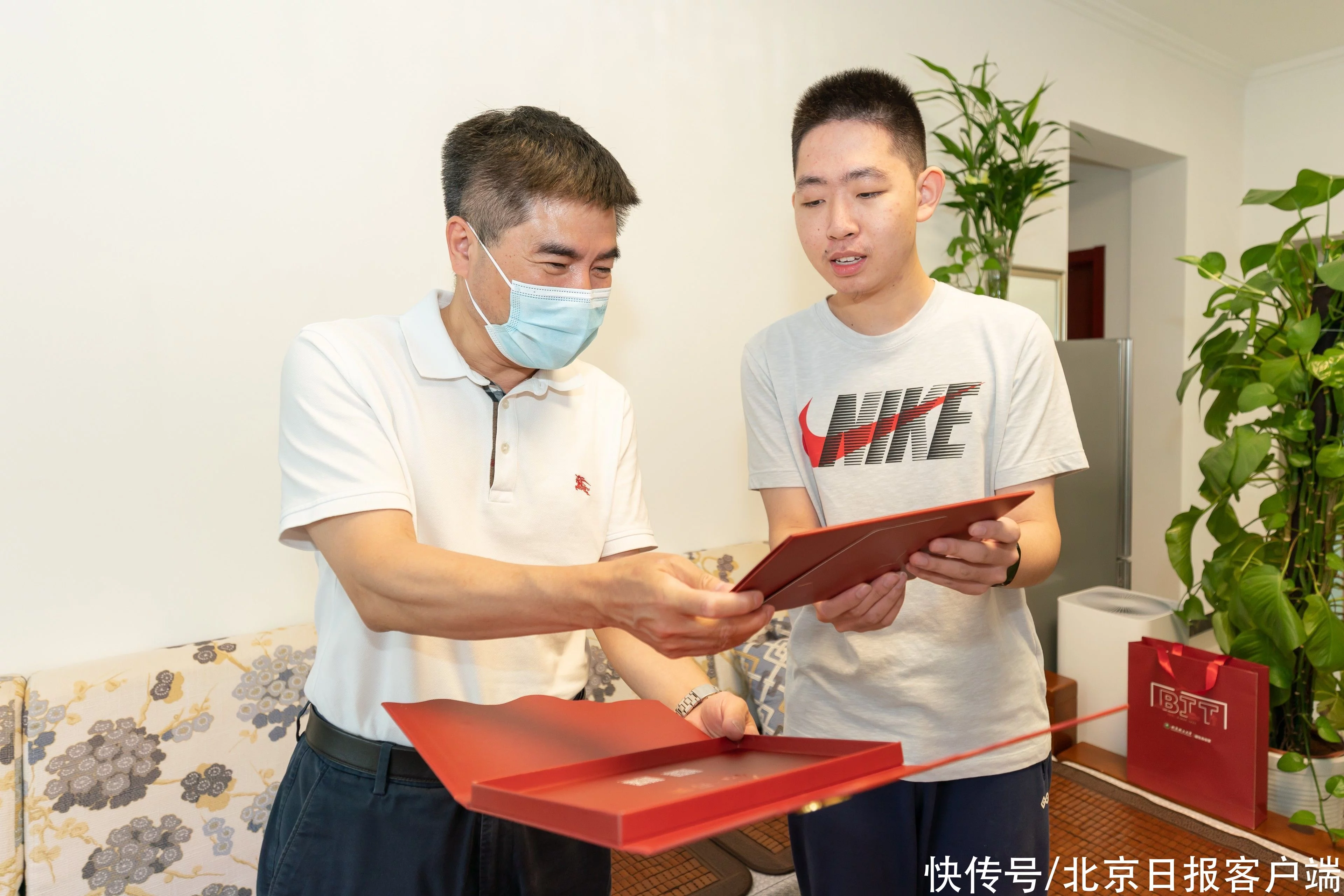 北理工副校长李振键将2022年0001号本科生录取通知书送至刘煜东家中,并与刘煜东同学共同开启录取通知书礼盒