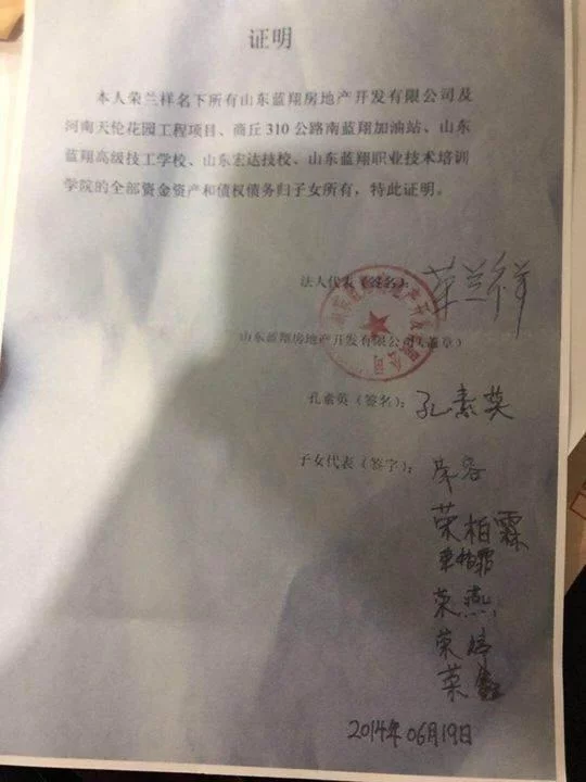 2014年3月,荣兰祥和孔素英开始打离婚官司,6月份,这对夫妻正式协议离婚,荣兰祥还当场写下一纸证明,将包括天伦花园在内的房产赠予6个子女,但是,并没有办理过户手续。