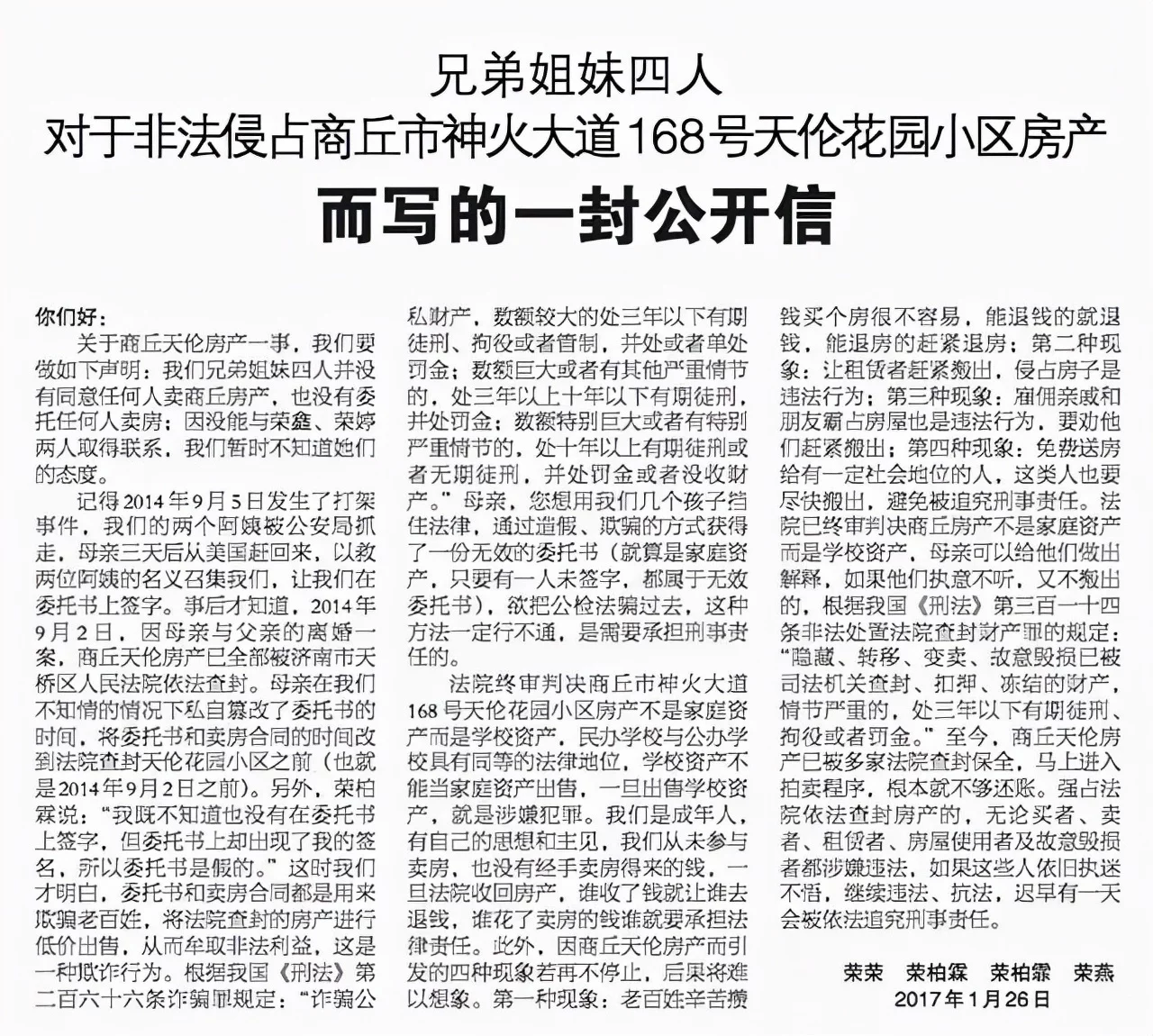 这个时候,急火攻心的孔素英却早在2014年开始就操盘起了该处房产的出售,据孔素英四子女登报声明称母亲孔素英在他们不知情的情况下私自篡改了委托书的时间,将委托书和卖房合同时间改到法院查封前,以此欺骗老百姓,将房子低价出售,从而牟取非法利益的行为。
