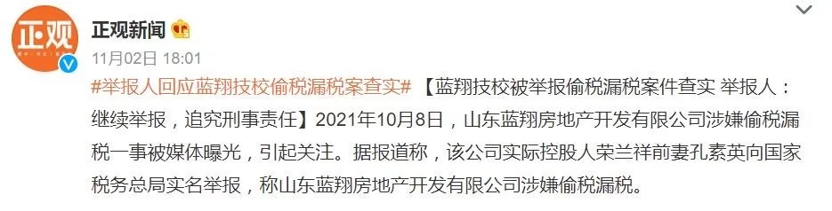 2021年10月29日,针对蓝翔技校被董事长前妻举报涉嫌偷税事件,商丘市税务局稽查局进行了正式回应,依照荣兰祥前妻孔素英提供的线索,山东蓝翔旗下房地产公司涉偷漏税一案,已被商丘市税务局查实,经查,该公司自2014年至2019年六年年度,累计少缴城镇土地使用税达136万余元。