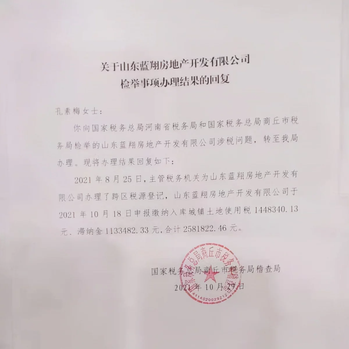 而这份回复文件,无疑坐实在了荣兰祥前妻的指控,有感兹事体大,山东蓝翔房地产开发公司于10月18日完成了欠税和滞纳金共计258万余万的申报。讽刺的是,接受媒体采访时,荣兰祥还装无辜称对于前妻举报的涉百万偷税一概不知。