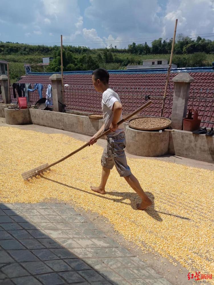 中江县普兴镇石龙店村,眭周全和父亲眭显乐冒着烈日,一起来到家附近的田里干农活。中午时分,他又赶回家里做饭;午饭后,一家人将刚收获的玉米脱粒,他又在院子里晾晒起了玉米;傍晚,他又和父亲到地里搬玉米……