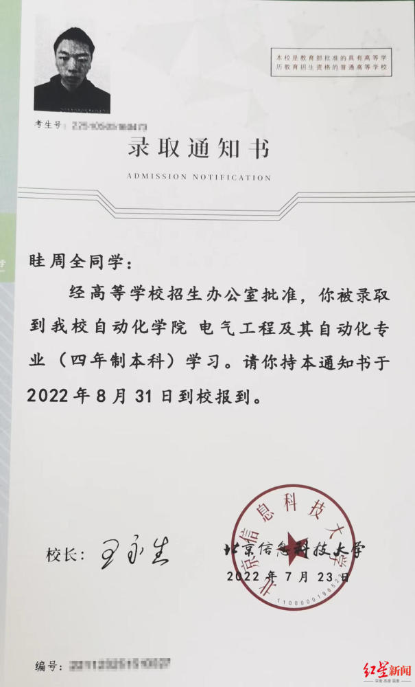 面对爱心人士及组织的帮扶资助,眭周全更加努力地学习,今年高考取得582分的成绩,成功被北京信息科技大学录取。8月1日,他已收到大学录取通知书。