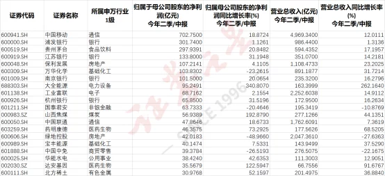 具体来看,三大运营商之一的中国移动暂列A股半年度盈利王。