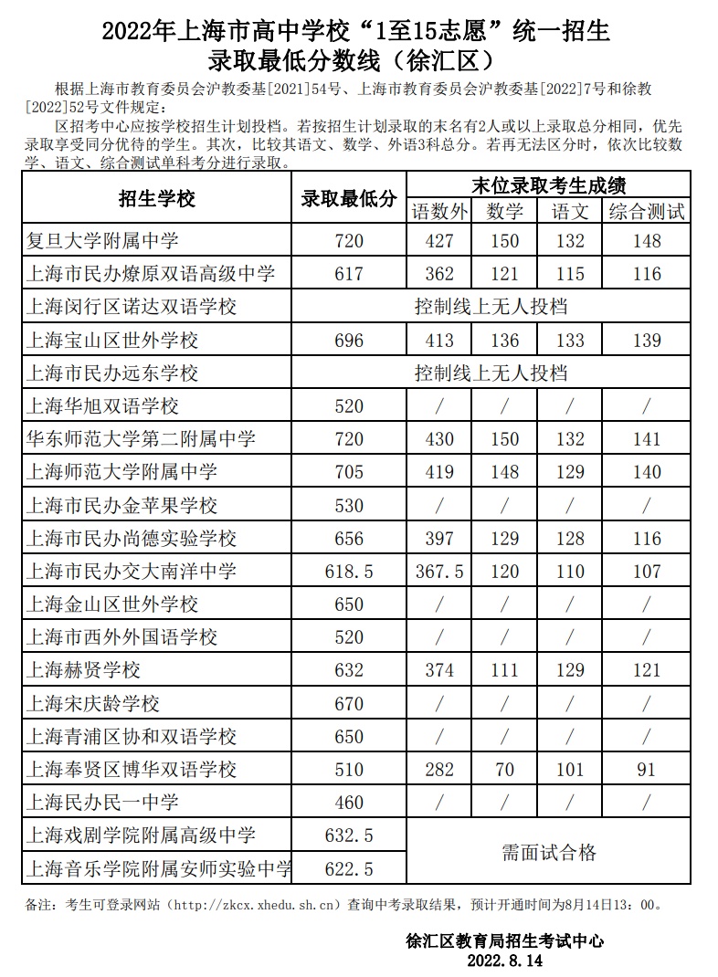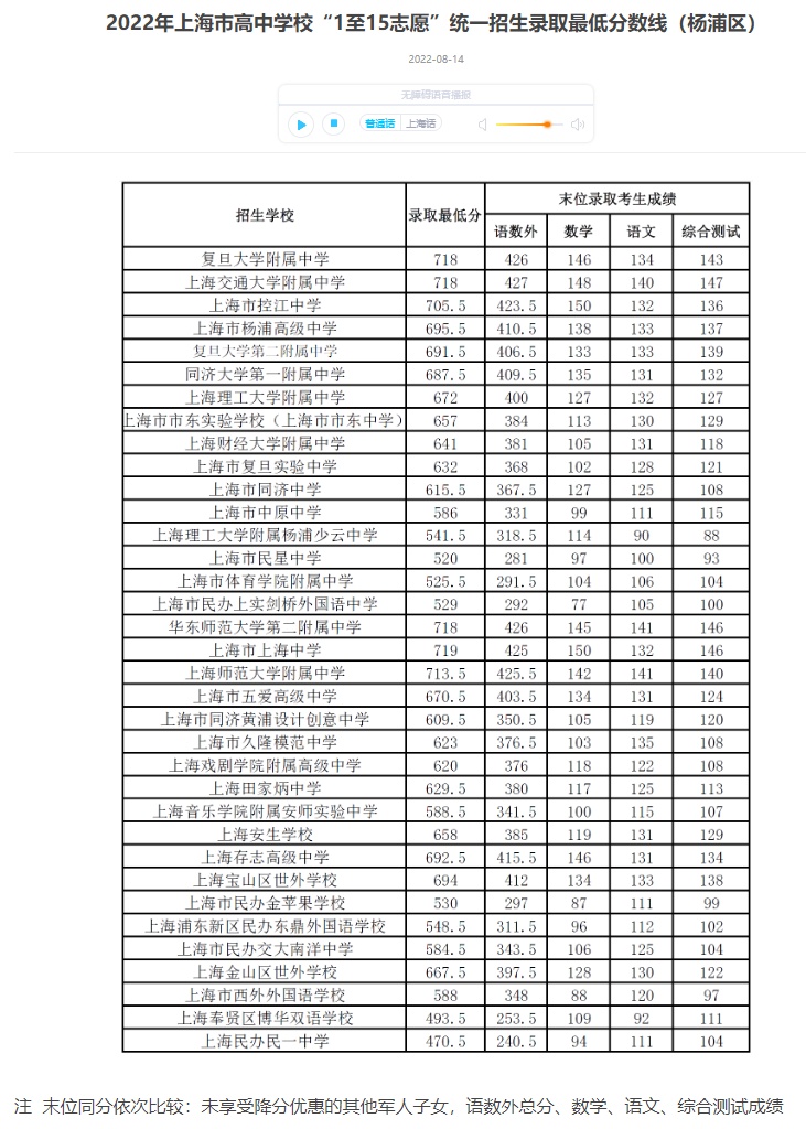 今天(8月14)上午,上海各区公布了统一批次1至15志愿招生录取的最低分数线,学生可通过报考区的招考机构网站查询录取结果。