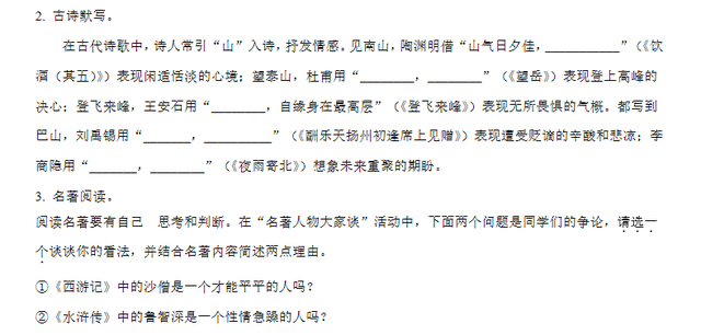 看了看语文试卷,古诗词和阅读部分都是课本知识,会背教材上的古诗词、能理解名著的基本人物形象,就可以回答,拓展的部分不算多。
