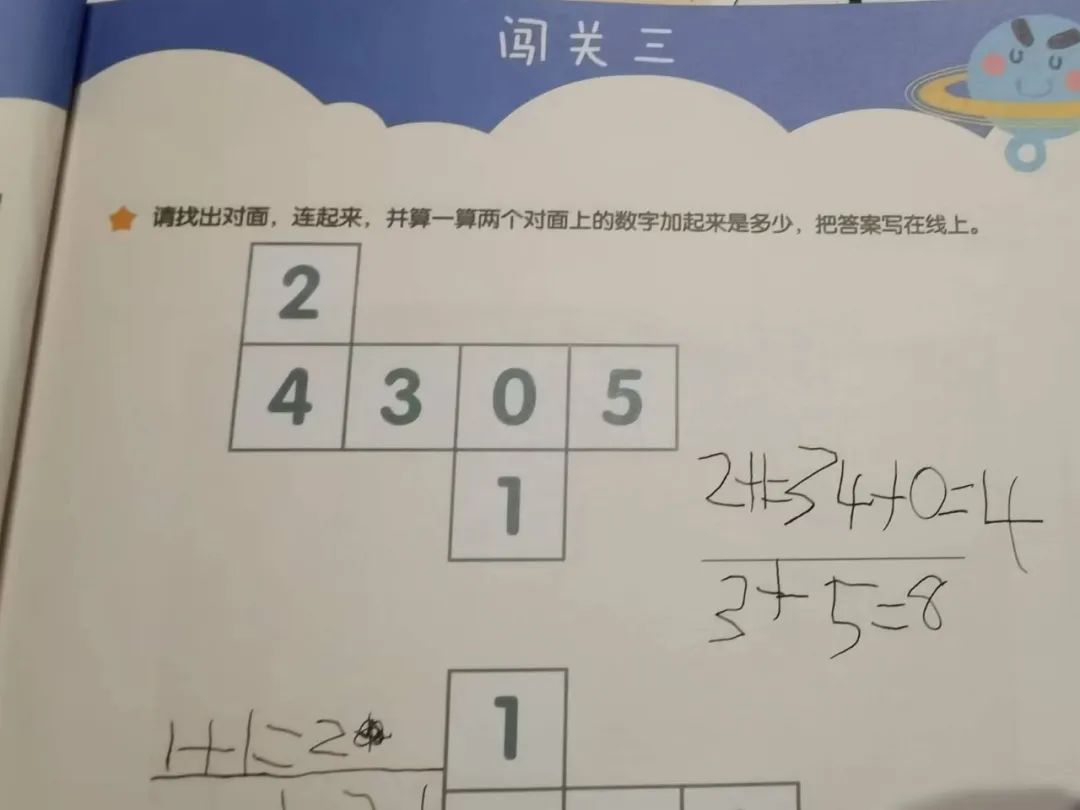 没错,《摩比爱数学》中班有一个章节知识点一样,甚至比中考卷还难一点呢,要计算两个对应面的数字之和。