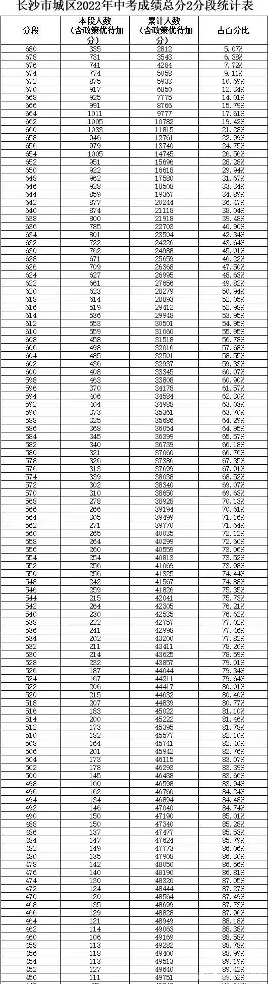 长沙市2022年中考分数公布,引起了长沙市民的高度关注。家长面对长沙市总成绩2分段统计表,也在评估自己的孩子到底能上哪所高中。吃瓜群众(非今年中考生家长)最关心的莫过于今年四大名校录取分数线,以及多少分才能上公办高中。小编根据2021年相关数据,以及2022年的新的变化进行了大概估计。长沙市2022年中考分数线大预测,四大名校录取线为678分(非指标生)。