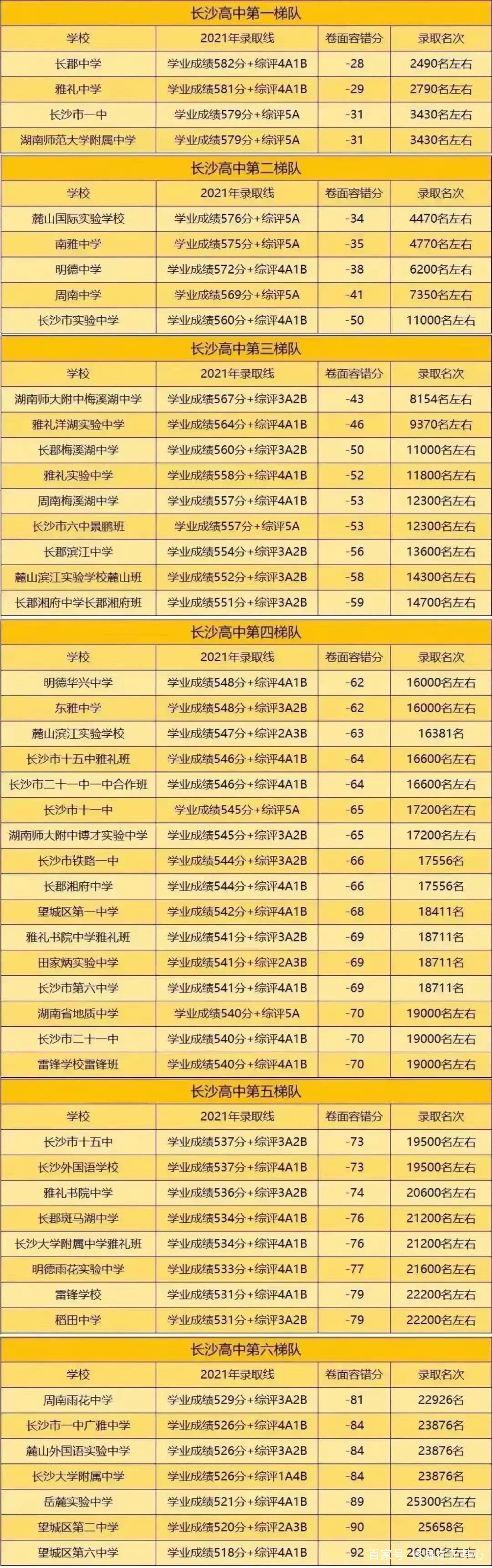 去年长沙四大名校的录取分数线最高的长郡中学为582分,录取名次为2490位,最低为579分,位次为3430分。全市公办高中最低录取分为518分,位次在26000左右。