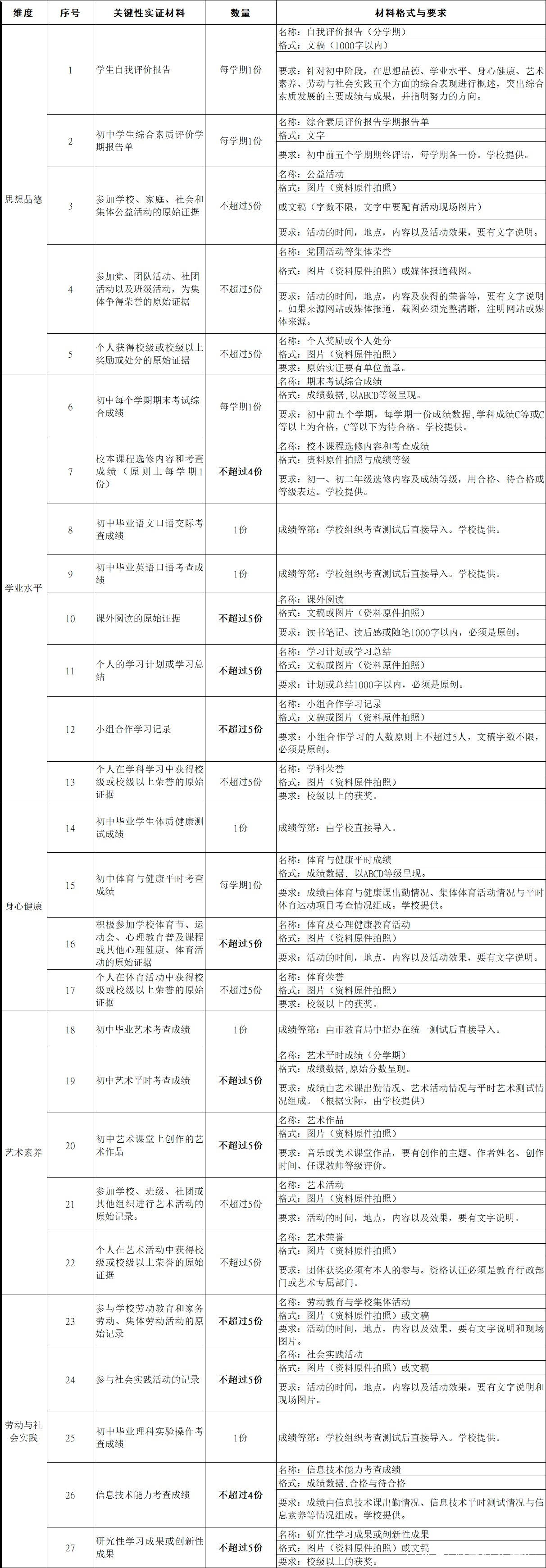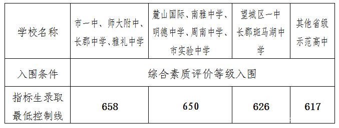 2、综合素质评价控制线要达标。报考长沙市一中、湖南师大附中、长郡中学、雅礼中学、明德中学、周南中学、市实验中学、南雅中学、麓山国际实验学校等第一批录取学校,综合素质评价结果最多允许有一个B等;