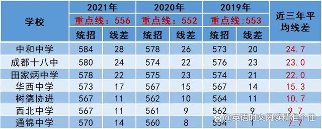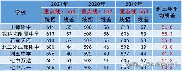 四川师范大学附属中学(川师大附中)、成都教科院附中(教科院附属中学)、成都市石室天府中学(石室天府)、成都列五中学(列五中学)、北二外成都附属中学成都七中万达学校(七中万达)、成都七中八一学校(七中八一)7所高中,近3年平均线差在40-60分。