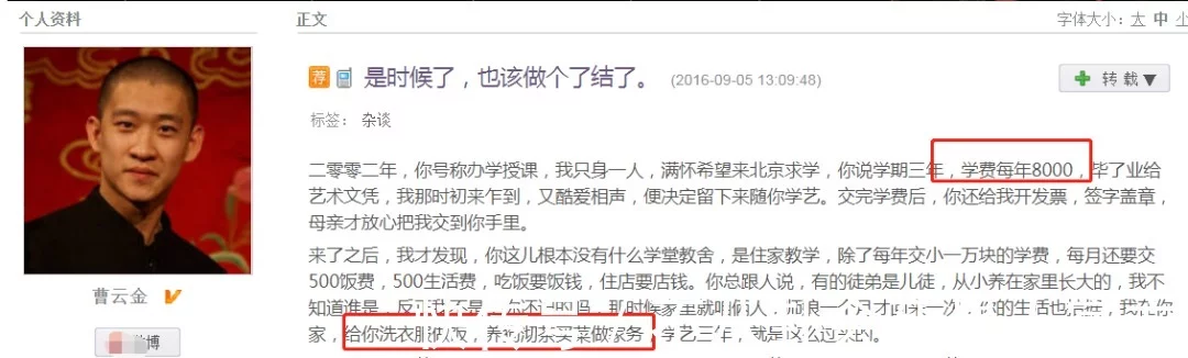 6年后,郭德纲重修家谱之际,曹云金发六千余字长文,发泄自己藏了多年的不满,细数郭德纲n宗罪:被赶出家门、被打压、被要求交8000元的学费以及各类往事,怨气与恨意溢满文字。