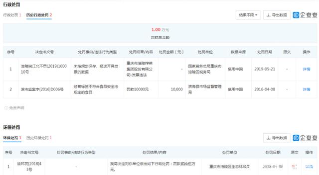此外,涪陵榨菜集团在2019年因未按规定保存、报送开具发票的数据受到行政处罚;还于2016年因经营标签不符合食品安全法规定的食品被罚款1万元。