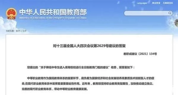 近日,教育部在《对十三届全国人大四次会议第2629号建议的答复》中,对提出的关于降低中专生进入高等院校进行全日制教育门槛的建议进行了答复。