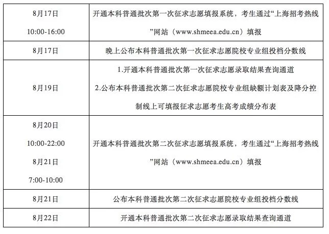 此外,市教育考试院还将于8月19日在上海招考热线网站公布本科普通批次第二次征求志愿院校专业组缺额计划表以及降分控制线(385分)上可填报征求志愿考生高考成绩分布表。