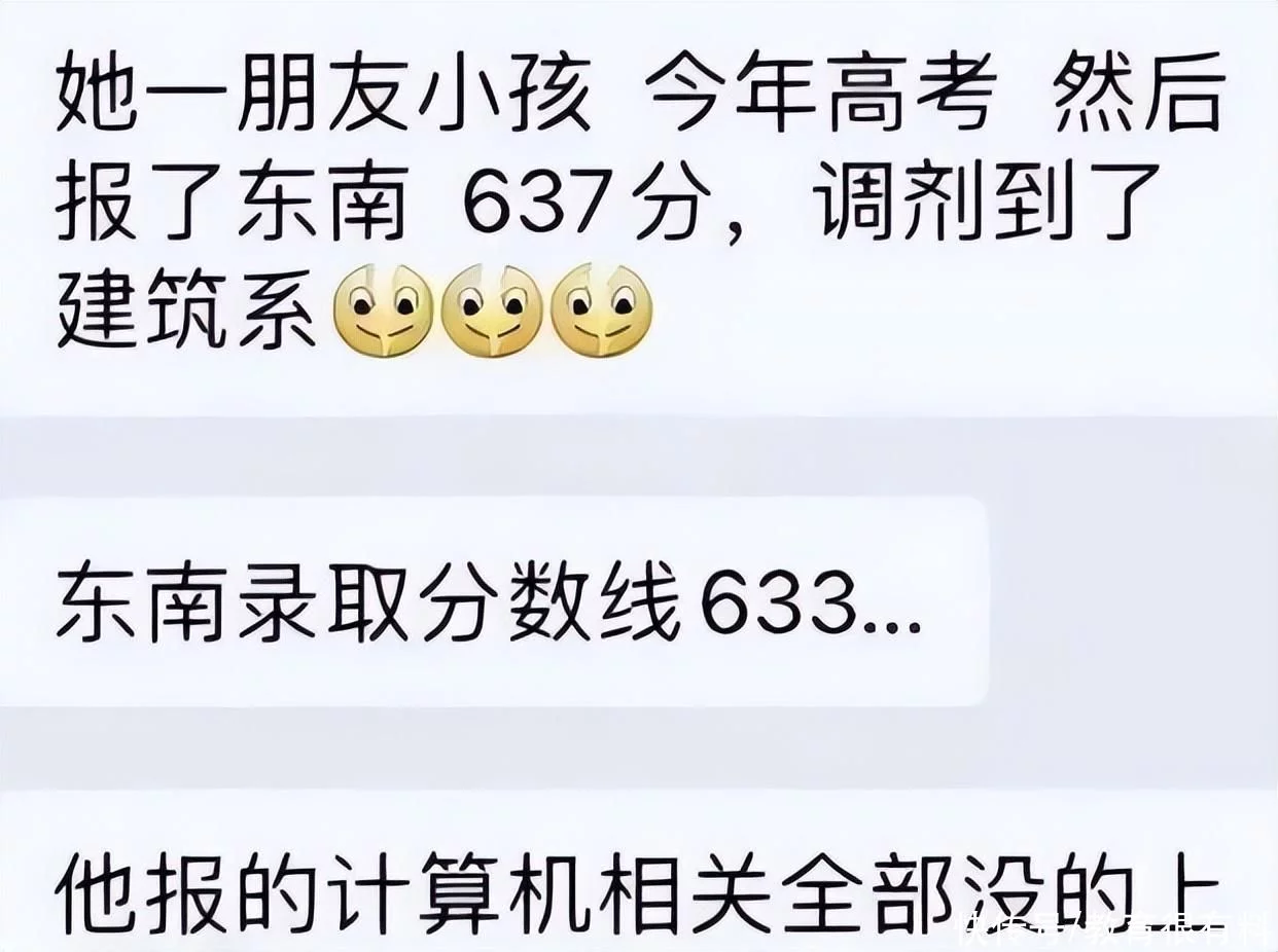 于是尴尬的一幕出现了,因为最近计算机相关专业过于热门,导致小高的分数并没有达到填报志愿的录取分数线,于是就被东南大学调剂到了建筑系。