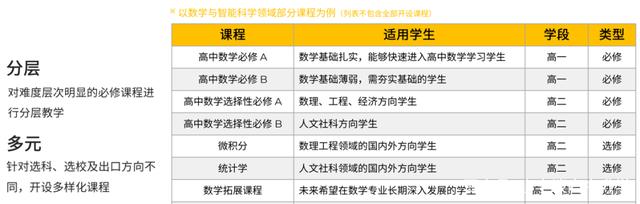以数学学科的部分课程为例,在国家必修课程模块,高中数学必修 A针对数学基础扎实、能够快速进入高中数学学习的学生;高中数学必修 B针对数学基础薄弱、需夯实基础的学生;高中数学选择性必修 A针对数理、工程、经济发展方向的学生;高中数学选择性必修 B针对人文社科发展方向学生。