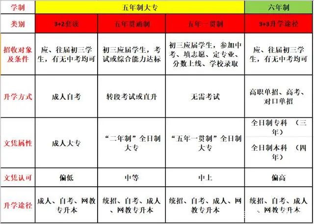 我们可以用一张图从学制、类别、招收对象及条件、升学方式、文凭属性、文凭认可、升学途径,这七大方面对比各个学制之间的区别以及优劣。