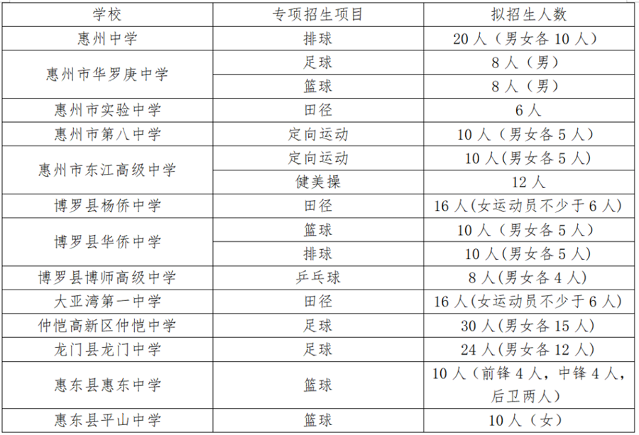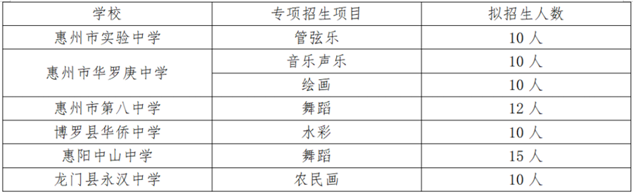 今年艺术体育类专项生招生条件有变化近日,2022年惠州市各高中阶段学校陆续发布艺术体育类专项招生简章,其中艺术类拟招77人,包括管弦乐、音乐声乐、绘画、水彩、舞蹈、农民画等专项;体育类拟招208人,排球、足球、篮球、田径、定向运动、健美操、乒乓球等专项(具体招生计划见下表)。符合条件的考生可通过相关学校的网站或微信平台报名,各校艺术和体育类专项生招生考试将于5月8日举行。需要注意的是,在今年各学校招收专项生的条件相比往年有变化。今年,不少学校在招生简章中注明,报考艺术类专项生符合我市中考报名条件,且在初中阶段参加过市级以上教育行政部门主办的艺术活动,并获得三等奖以上(持有证书原件和复印件)。每位考生只允许选报一所学校的一个专项。报考体育类专项生,考生应符合以下条件之一,并满足所报考学校招生简章所列出的其他条件:(一)在初中阶段获得国家三级运动员以上(含三级)等级证书。(二)在初中阶段参加相关体育比赛中成绩达到国家三级运动员等级标准。(三)在初中阶段参加市级以上(含市级)体育比赛中获前八名或代表学校或社会团体参加省级以上(含省级)体育比赛者。