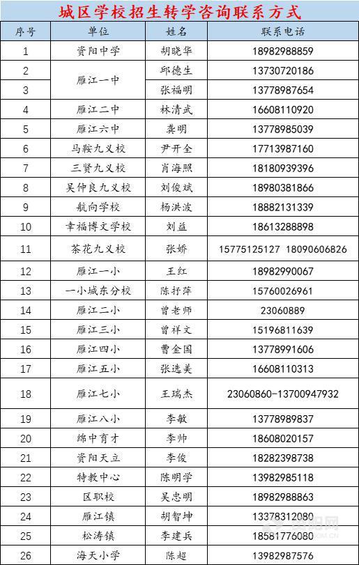 一小、二小、三小、四小、五小、七小的小学毕业生,5月20日前可以从雁江六中、吴仲良九义校、航向学校、雁江区玉柴学校、幸福博文学校、茶花九义校、绵阳中学资阳育才学校(民办)、资阳天立学校(民办)等学校中选报一所学校就读,选报民办学校的,按民办学校招生要求办理,选报公办学校的于6月25日到招生学校报名并采集信息。