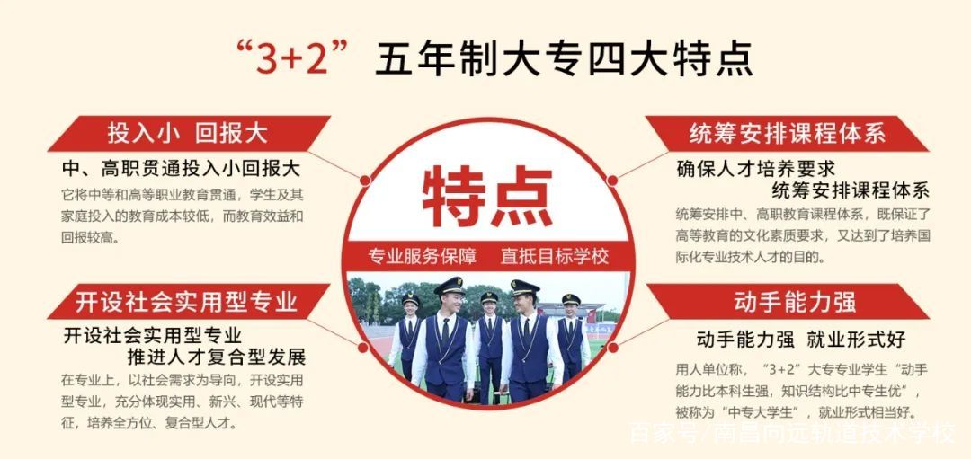 前三年实行中专收费标准、分段式教学,后两年实行大专收费标准。教育形式3+2大专是高等职业教育的一种形式。由部分重点中专院校和高等职业技术学院经省有关部门批准举办、招收应届初中毕业生,学制五年,前三年中专毕业后发南昌市验印的中专毕业文凭,后两年毕业后发省教育厅验印的全日制大专毕业文凭。3+2大专班的学生毕业后可参加专升本继续深造。
