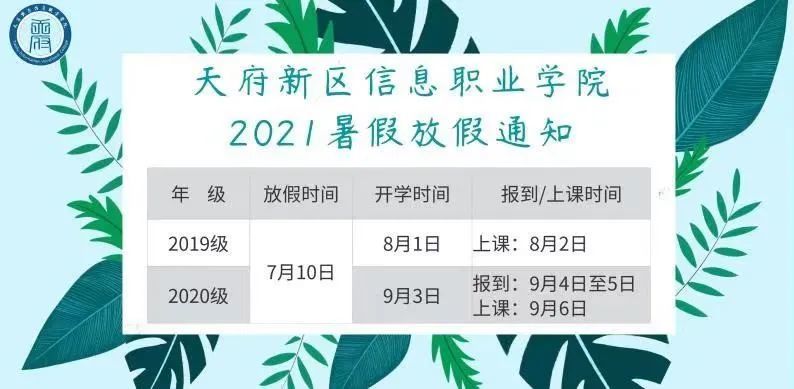 2019级、2020级学生放假时间为2021年7月5日至2021年9月11日,9月12日报到,9月13日行课。