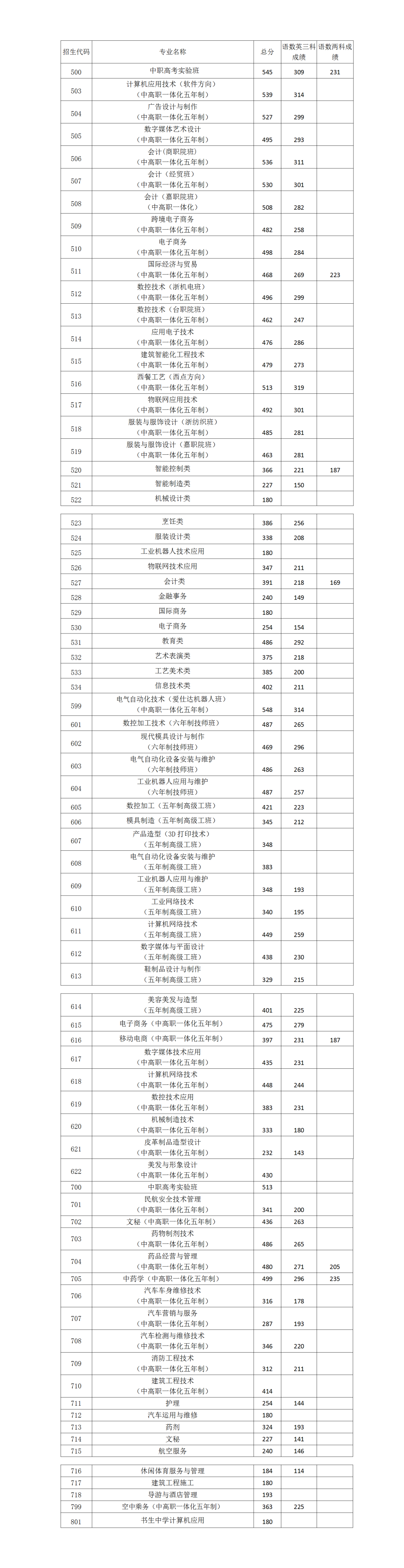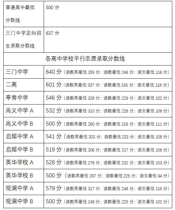二、重点普高指令性计划(除定向生、体艺特长生)预录取分数线
