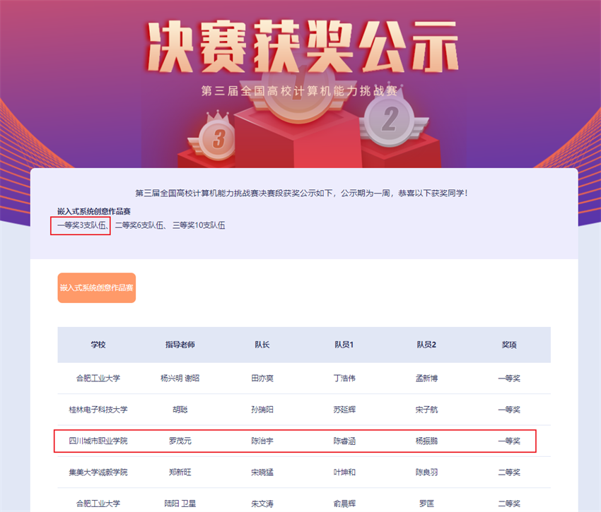 近日,由全国高等学校计算机教育研究会主办、合肥工业大学承办的第三届全国高校计算机能力挑战赛嵌入式系统创意作品赛决赛在合肥举行。我校信息技术学院物联网应用技术专业3名同学在罗茂元老师的指导下,围绕工业互联网与嵌入式系统的结合,在限定期限内完成工业互联网嵌入式作品实物的设计与制作,通过了层层考验在西南赛区选拔赛中脱颖而出,成功晋级决赛。