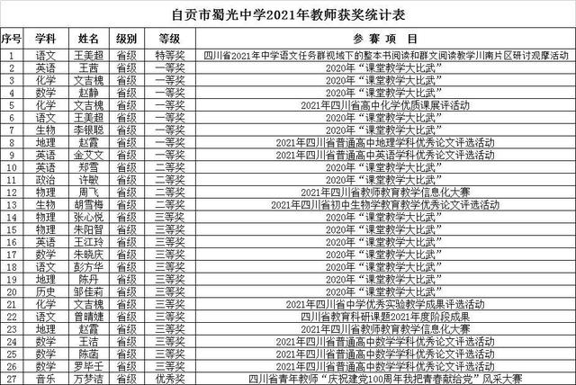 卓有成效的课堂教学、桃李天下的育人本领、丰硕耀眼的教育成就,是蜀光中学名师打造工程的最高目标。2021年,党委书记、校长蒯晓牛被评选为盐都名校长;朱阳智老师被评为四川省特级教师,并荣获自贡市学术和技术带头人称号;曾晴婕老师荣获自贡市最美教师称号;王伶老师被评选为盐都名师。