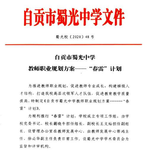 两年前,四川省自贡市蜀光中学推出《教师职业规划方案——春雷计划》,重点从新手孵化、骨干培养和名师打造三个层面为教师量化考核专业业绩,量身定制职业规划发展。两年以来,上百名教师从中获得职业成长,学校更在省、市两级课堂教学大比武、论文大赛等赛事中夺得多个第一。