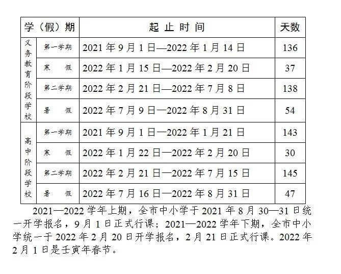 遂宁市义务教育阶段学生于2022年1月20日离校,2022年2月16日到校报名注册,17日正式行课;高中阶段学生于2022年1月23日离校,2022年2月16日到校报名注册,17日正式行课。