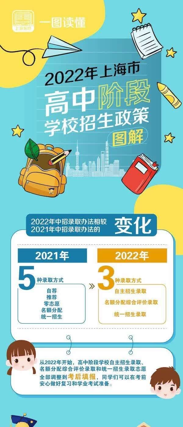 中国青年报客户端讯(中青报·中青网记者 魏其濛)2022年是上海市高中阶段学校采用新的招生录取办法的第一年,继2018年3月《上海市进一步推进高中阶段学校考试招生制度改革实施意见》公布、今年3月《上海市进一步推进高中阶段学校考试招生制度改革实施意见》公布后,市教委近日发布了关于落实改革细则的文件《关于2022年本市高中阶段学校招生工作的若干意见》、《关于市实验性示范性高中名额分配综合评价录取学校综合考查的指导意见(试行)》。