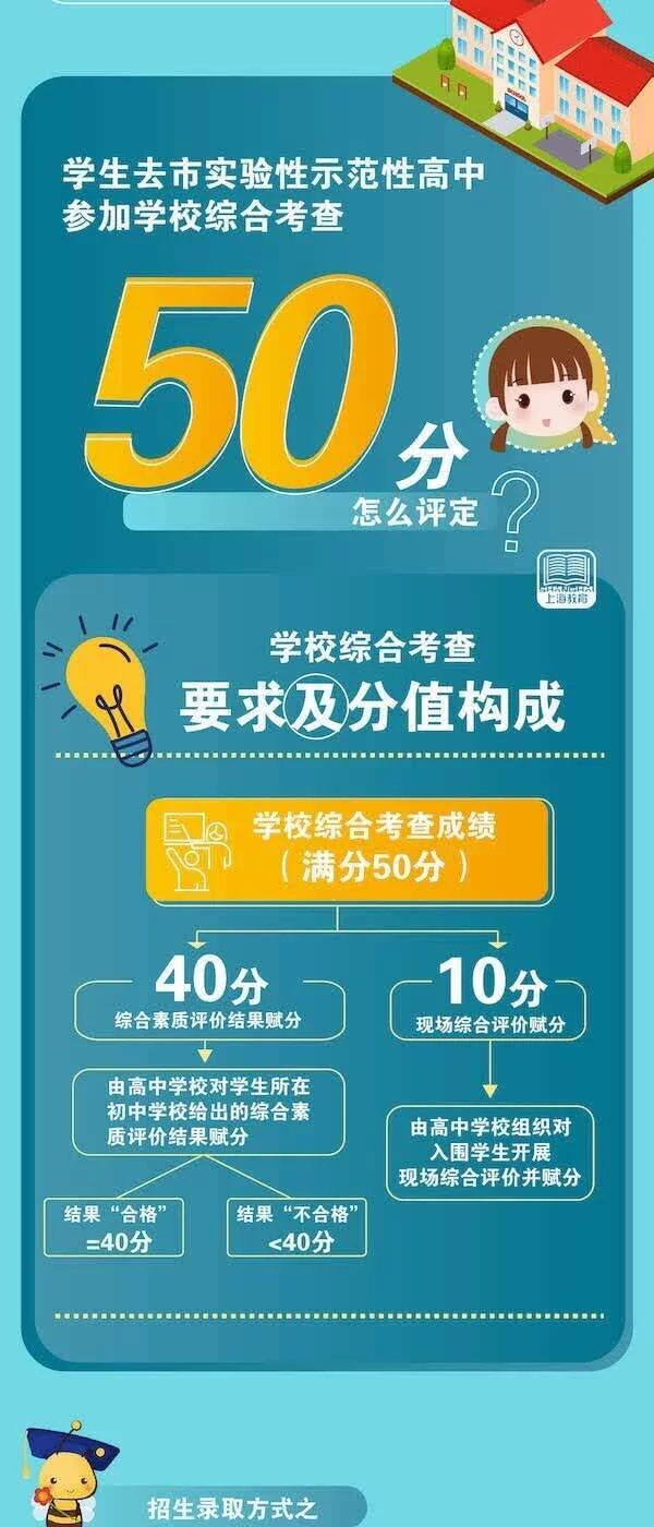 根据以上文件,市实验性示范性高中名额分配比例扩大,各类初中的学生都有机会进入市实验性示范性高中;对于全面发展的学生,无须纠结于单一的分数,通过名额分配综合评价录取也有机会进入心仪的学校;学生还可以通过自主招生和统招批次被市实验性示范性高中录取;志愿填报和自主招生改在考后进行,让学生们安心备考。 值得注意的是,上海将首次实施市实验性示范性高中名额分配综合评价录取,积极探索并扩大将市实验性示范性高中的招生名额,分配到不选择生源的初中学校。 学校综合考查(满分50分)由两部分组成,一是高中学校结合入围学生综合素质评价结果赋分(满分40分)。先由学生所在初中学校围绕《上海市初中学生综合素质纪实报告》给出综合素质评价结果,分为合格不合格;再由高中学校根据学生综合素质评价结果赋分,如合格即为40分,不合格的学生由高中学校结合《纪实报告》酌情扣分;二是高中学校对入围学生开展现场综合评价赋分(满分10分),由高中学校根据自身办学理念、人才培养目标等,组织入围学生进行现场综合评价。 为保障学校综合考查工作的公平公正,文件强调要严格执行公开与公示制度,严格执行招生利益相关方回避制度,严格执行相关保密与考试安全规定。例如,须组建若干评价小组,每个小组至少由七人组成,来源应多样化;须组建巡查小组,由责任督学、本校纪检工作负责人和家委会代表等组成,负责现场巡视监督检查工作;现场综合评价须实施全程录像,并采用随机方式确定学生与评价小组的匹配关系。对于招生学校违背综评导向、提前开展招生工作、提前承诺录取等违规行为,一经查实,依照有关规定核减下一年度自主招生计划。在考查各环节中如发现违规违纪行为,将严肃依法依规追究相关人员责任。 上海市教委副主任杨振峰表示,市教委改革的初衷就是促进学生全面发展,促进各类学校优质均衡发展。在双减背景下,关注学校的主体作用、学校在育人方面的突出贡献,成为教委思考的关键问题。此次发布文件是想通过综合评价撬动初中全面育人,改变高中在育人方式上唯生源的不良做法,同时也撬动家长更多地选择家门口的学校,从而实现教育生态更加良好,期待能让人人有可能,校校办精彩。