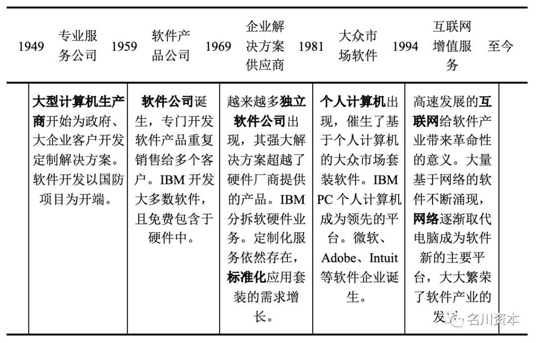 以史为鉴,可以知兴替。计算机原理、硬件、软件,乃至互联网的起源地在美国,考察其软件行业的发展历程(见表 1),可以对标研判国内软件行业的发展现状和趋势。