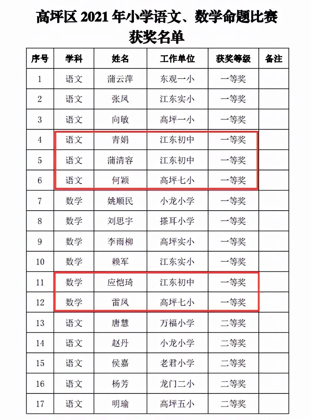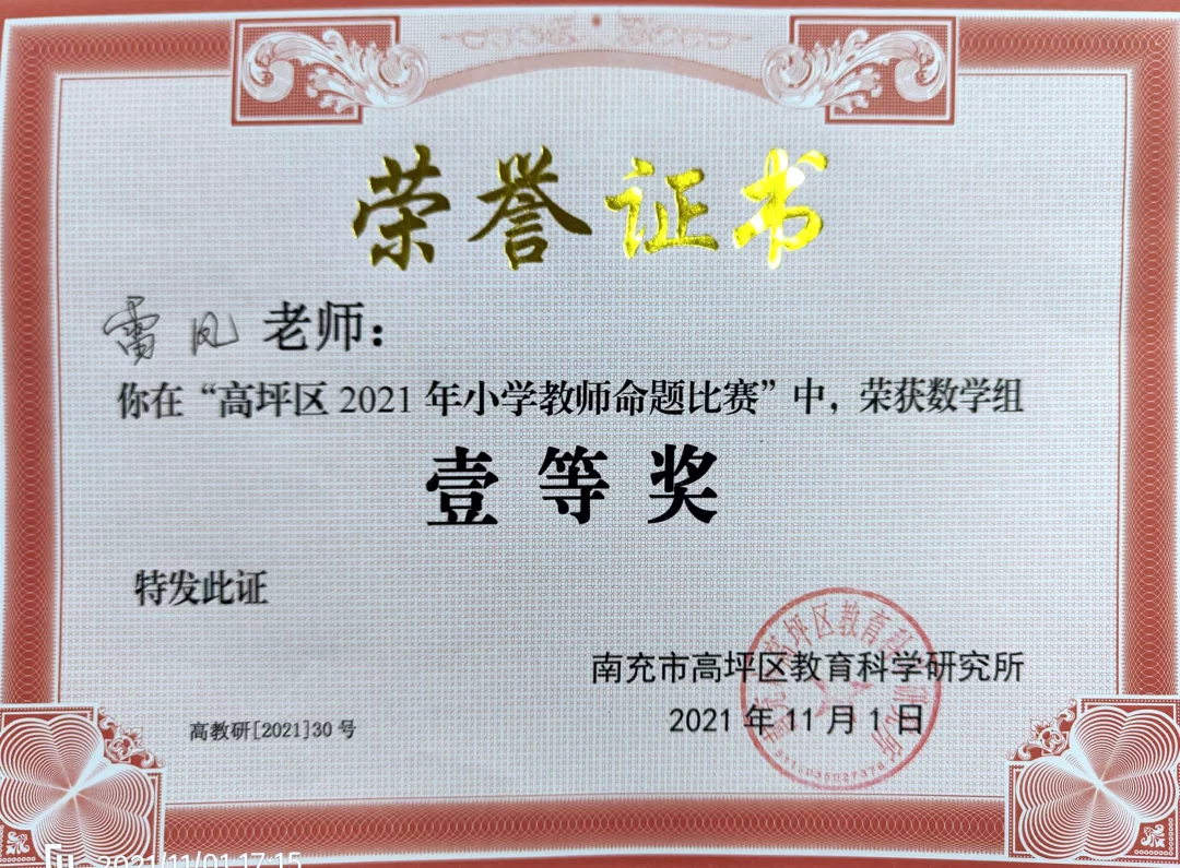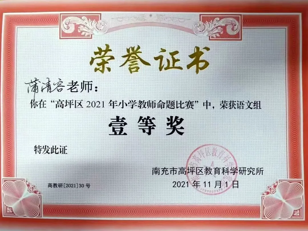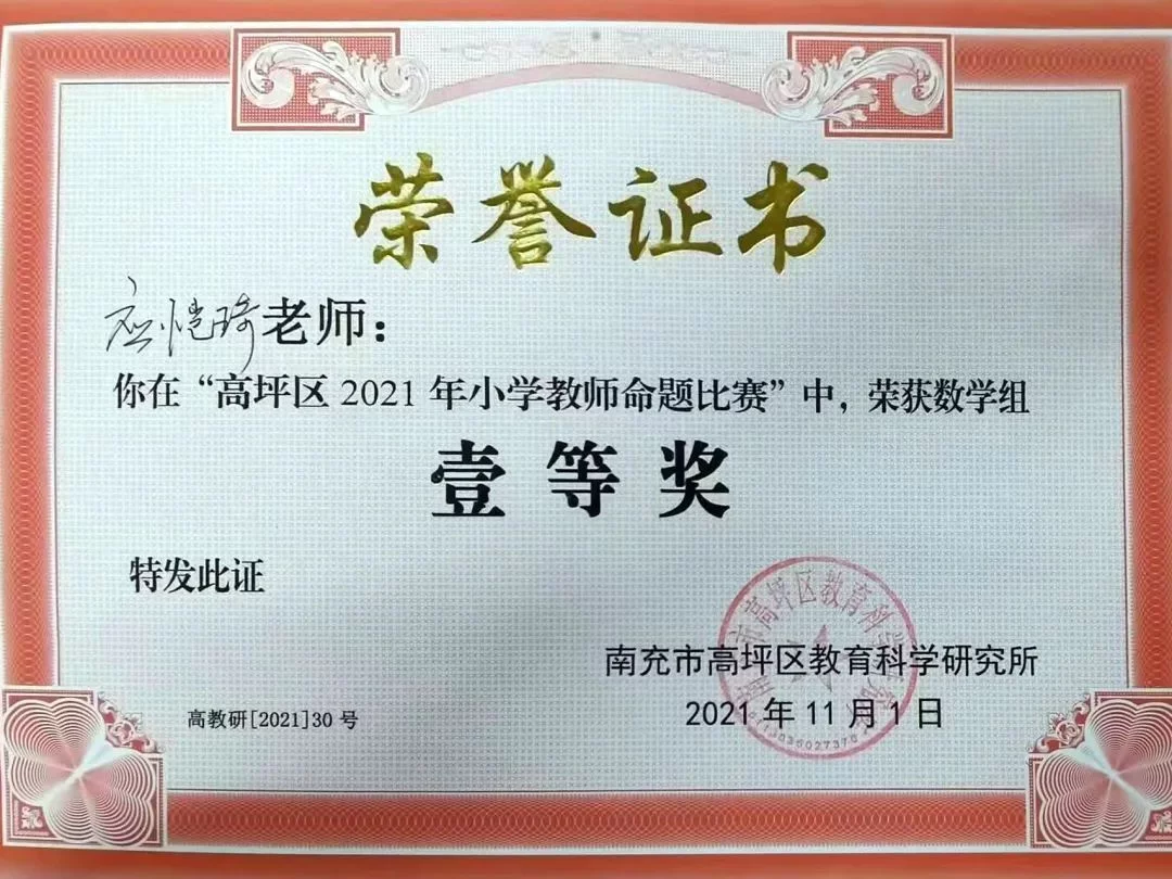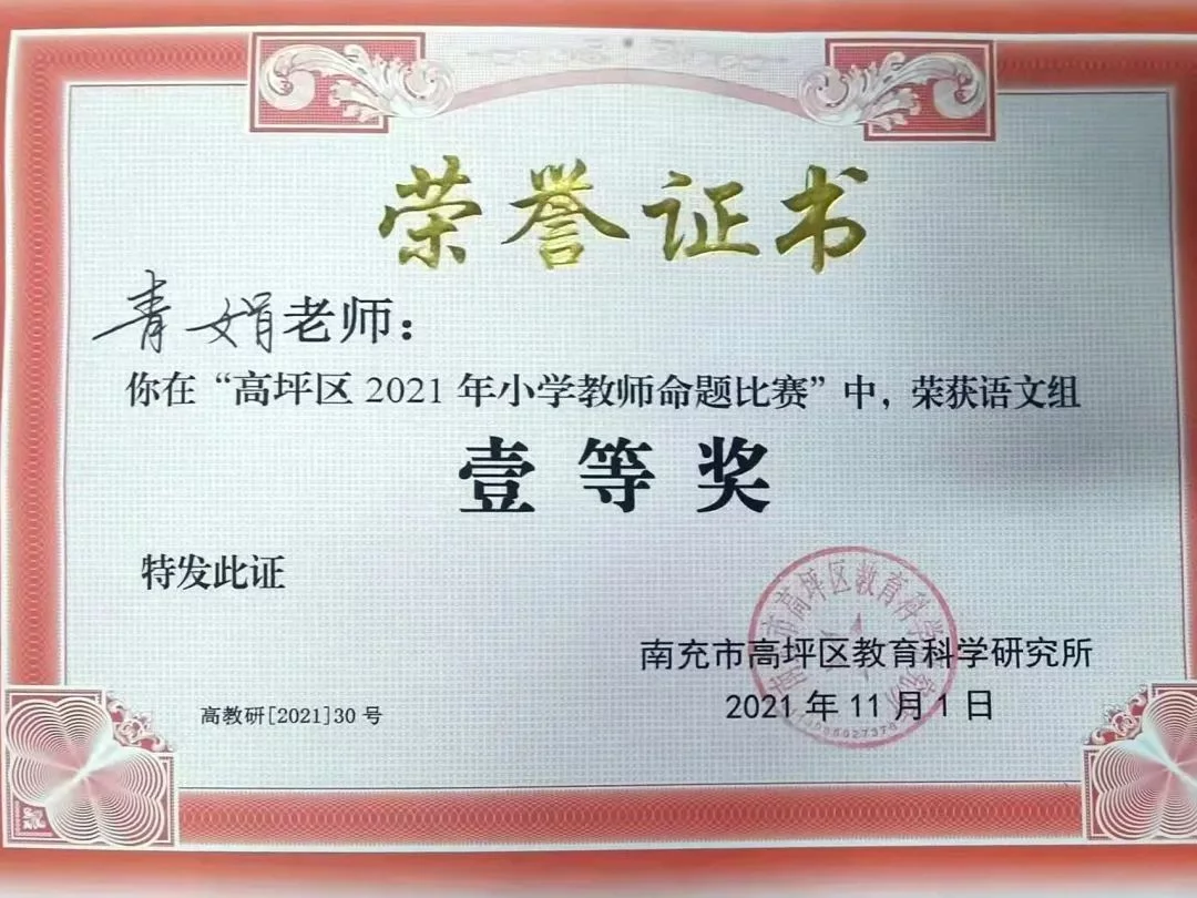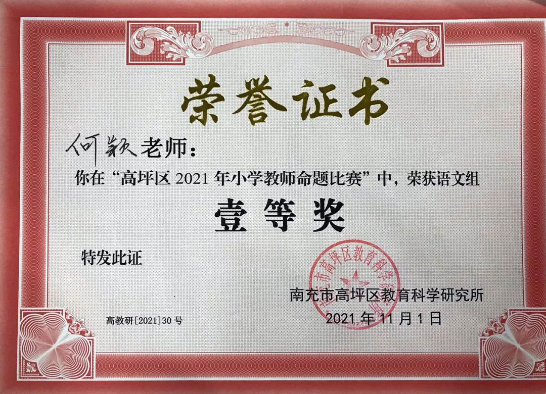 11月1日,在南充市高坪区教科所举行的“高坪区2021年小学语文、数学命题比赛”活动中,高坪七小白塔校区的何颖、雷凤老师,江东校区(江东初中)的青娟、蒲清容、应恺琦老师,从来自全区的28名参赛教师中脱颖而出,分别夺得学科命题大赛一等奖。