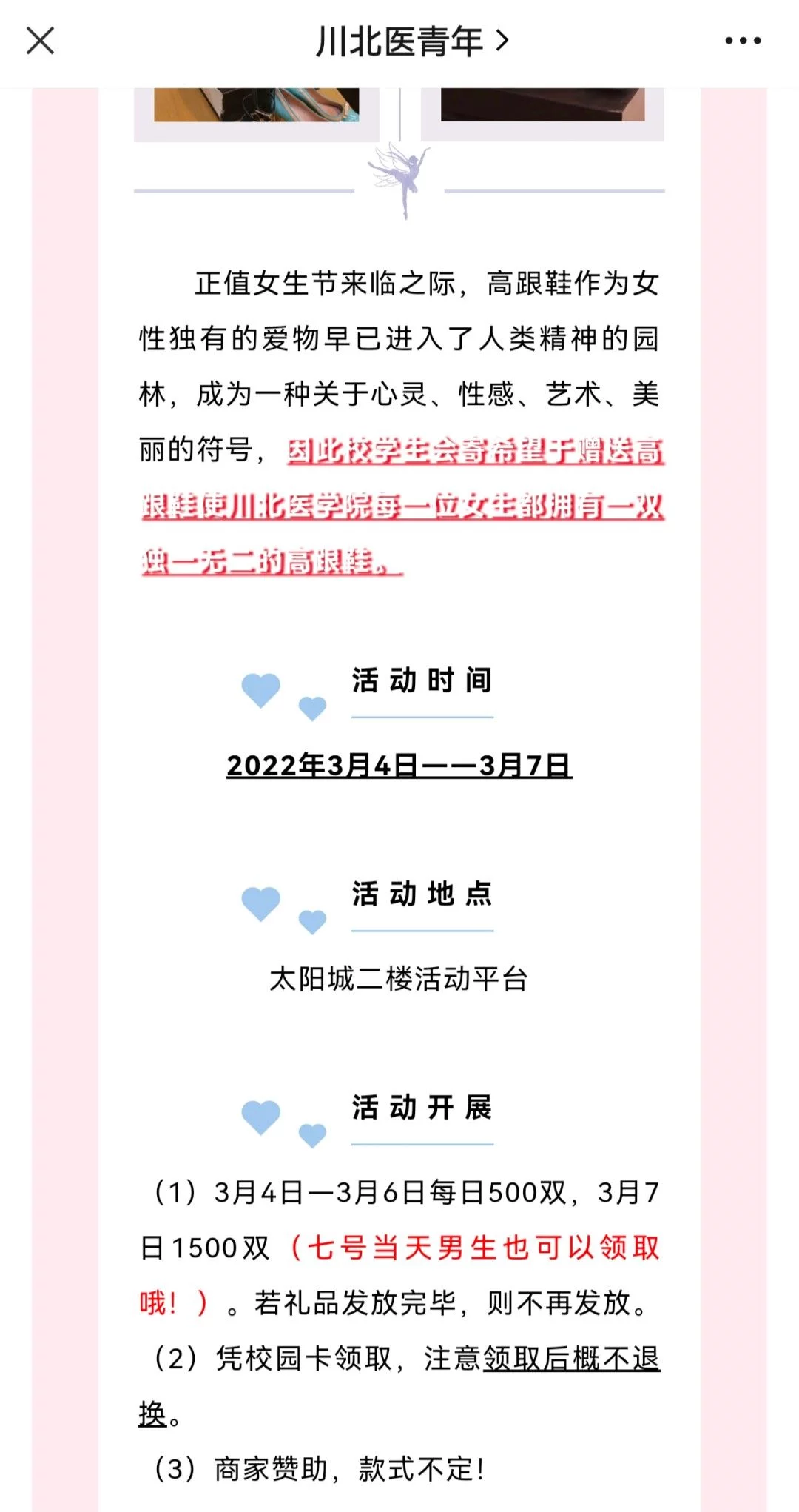 有人把鞋子送给网友记者发现,学校公众号有篇文章写道:“高跟鞋作为女性独有的爱物早已进入了人类精神的园林,成为一种关于心灵、性感、艺术、美丽的符号,因此校学生会寄希望于赠送高跟鞋,使川北医学院每一位女生都拥有一双独一无二的高跟鞋。”该文还特别提醒3月7日当天男生也可以领取,鞋子由商家赞助,款式不定。