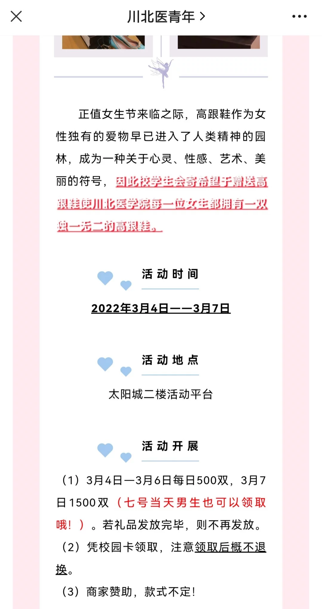 上述文章还写道:“高跟鞋作为女性独有的爱物早已进入了人类精神的园林,成为一种关于心灵、性感、艺术、美丽的符号,因此校学生会寄希望于赠送高跟鞋,使川北医学院每一位女生都拥有一双独一无二的高跟鞋。”该文还特别提醒3月7日当天男生也可以领取,鞋子由商家赞助,款式不定。