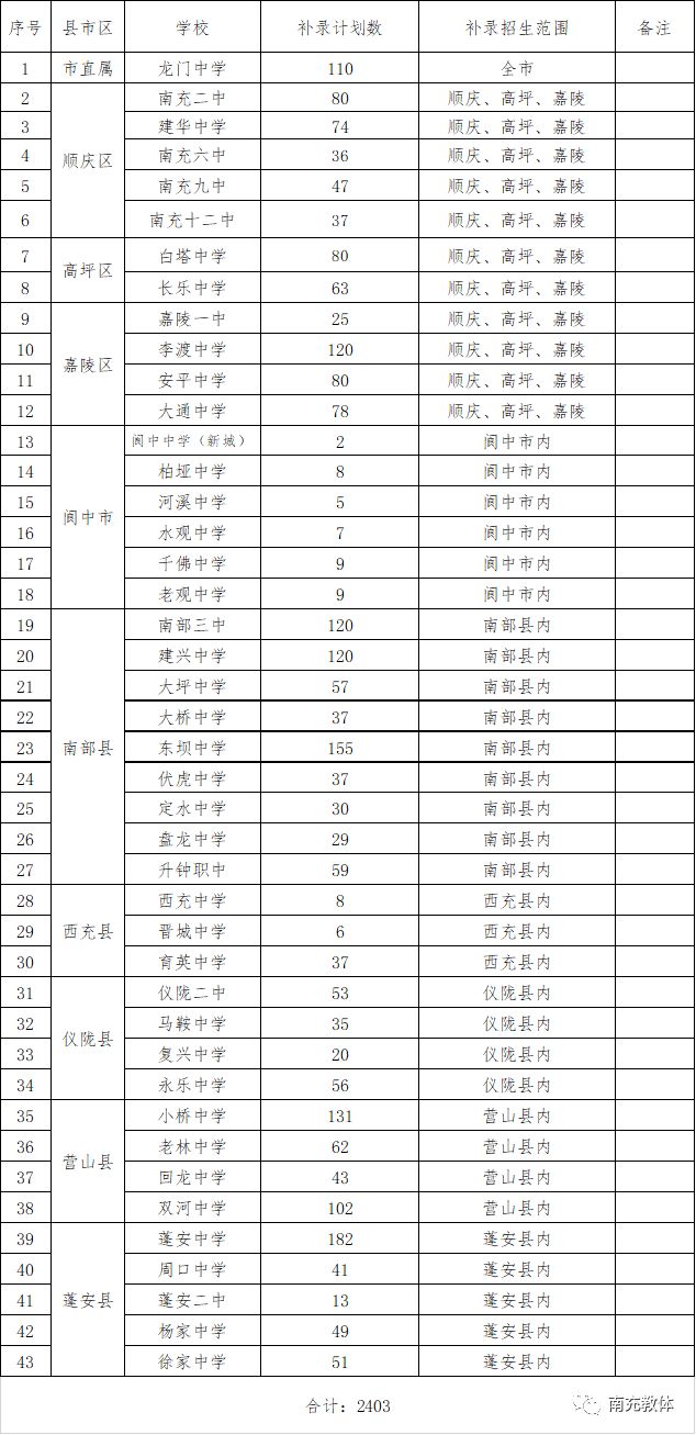 1.本着以生为本的原则,结合生源结构和高中学校布局考虑,南充市主城区(含顺庆、高坪、嘉陵三区)符合条件的考生可选择三区内参加补录的高中学校,不受区域限制。