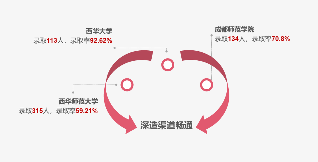 在2020届毕业生报考西华大学、西华师范大学和成都师范学院的“专升本”考试中,对口学生数3481人,报名考试数843人,录取数562人,录取率达到60.74%,相比2019年专升本录取率大幅提升。其中,西华师范大学录取315人,录取率为59.21%;成都师范学院录取134人,录取率为70.8%;西华大学录取113人,录取率为92.62%。