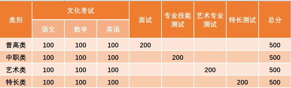 文化考试试题由省统一命制,分普高类、中职类。考试科目为语文、数学、英语三科,同堂分卷;每科满分100分,总分300分。