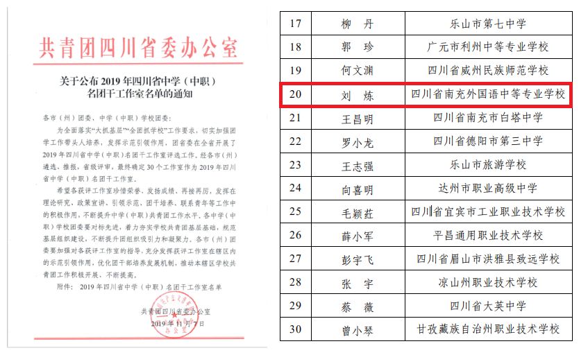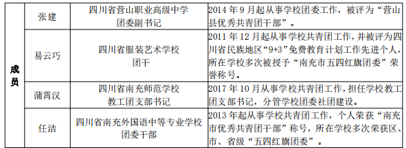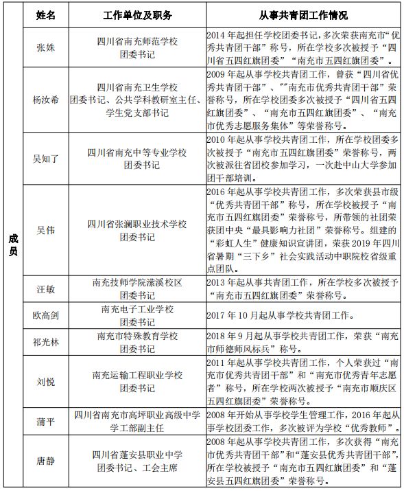 为全面落实“大抓基层全团抓学校”工作要求,切实加强团学工作带头人的培养,提升职业教育共青团工作理论研究水平,不断推动职业教育共青团改革向纵深发展,共青团四川省委今年在全省开展了首批省级中学(中职)名团干工作室评选工作,在团市委的坚强领导与支持下,由四川省南充外国语中等专业学校牵头成立的“四川省南充市中职名团干工作室”经市(州)遴选、推报、省级现场答辩、评审,最终从50余所中学(中职)学校中脱颖而出,被评为首批四川省中学(中职)名团干工作室。