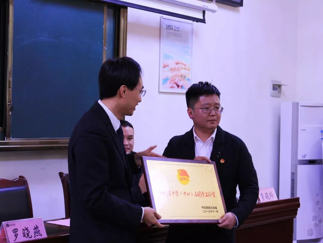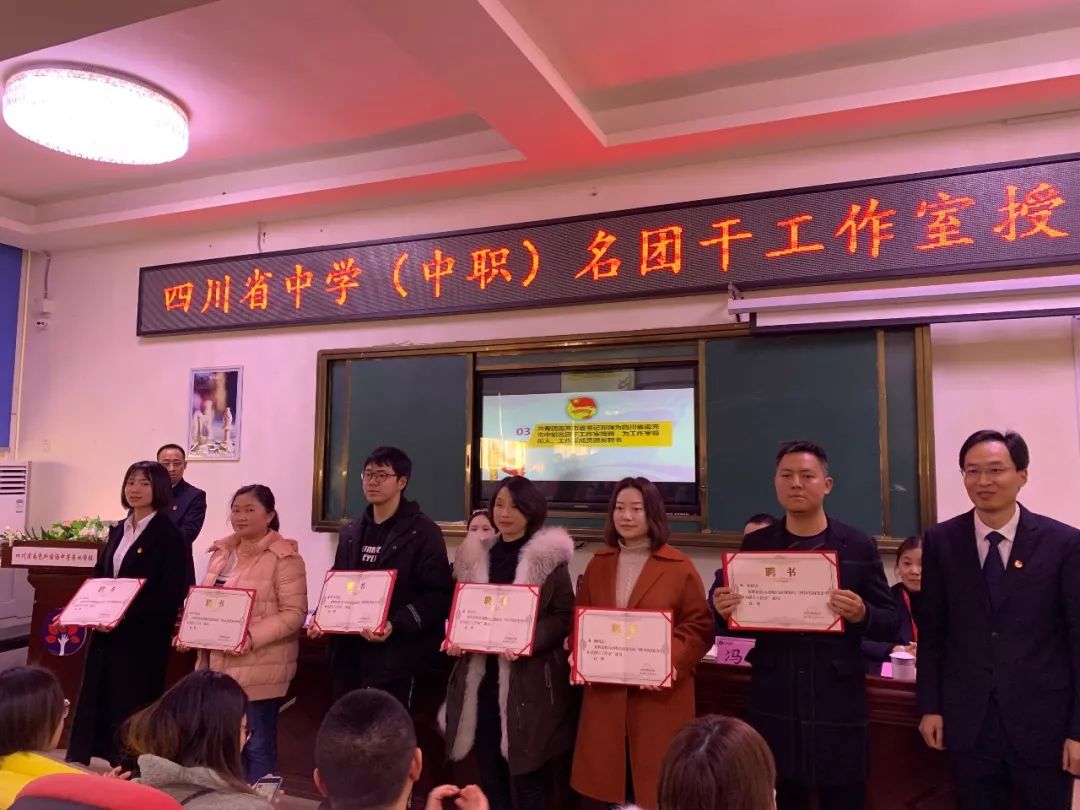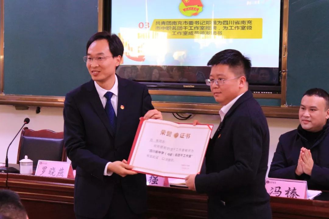 共青团南充市委副书记冯榛宣读了《关于公布2019年四川省中学(中职)名团干工作室名单的通知》和《四川省南充市中职名团干工作室成员名单》。共青团市委书记、工作室导师邓强为四川省南充市中职名团干工作室授牌、为工作室领衔人颁发了荣誉证书,并为工作室成员颁发了聘书。