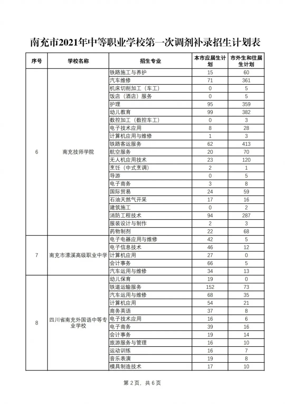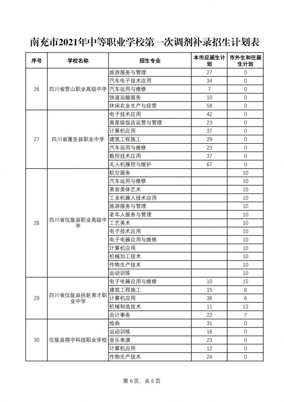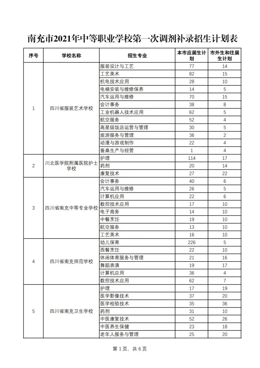 1.南充市2021年中等职业学校第一次调剂补录招生计划表