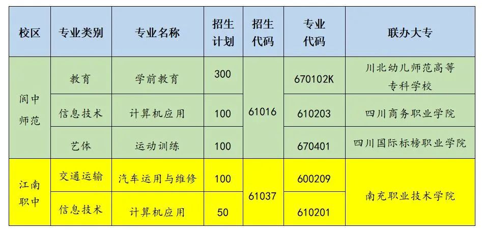 阆中师范、江南职中分别与川北幼专、四川商院、南职院、国际标榜等高职院校联合举办学前教育、计算机应用、汽车运用与维修、运动训练等全日制五年制大专,学生毕业后取得全日制大专文凭。