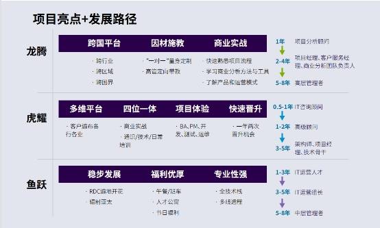 龙腾主要面向全球顶尖高校/商学院硕士在校生,虎耀面向一流高校IT/商学院本科及以上在校生,鱼跃计划招收普通高等院校大专及以上在校生。